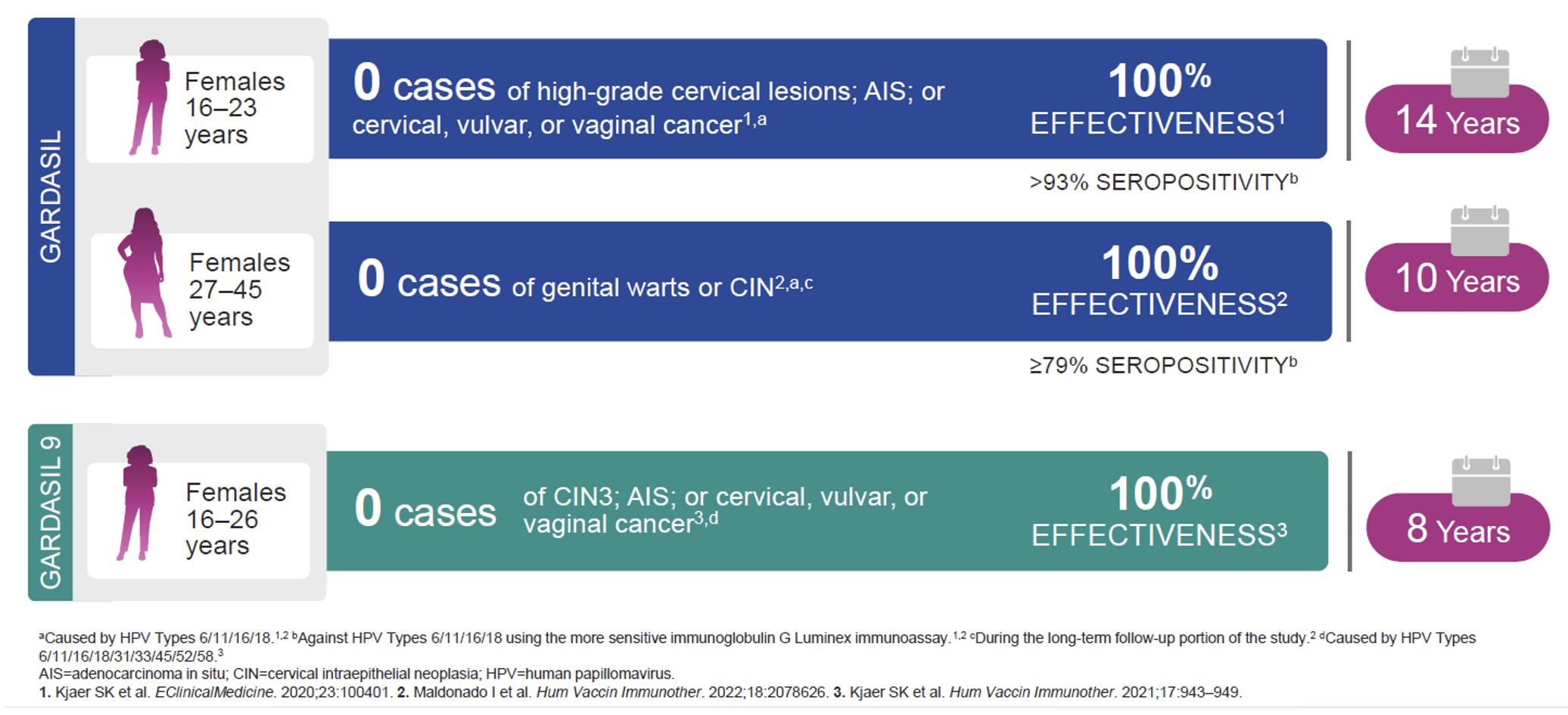 Long-term effectiveness and immunogenicity (up to 14 years) with GARDASIL® and GARDASIL® 9 in older adolescent and adult females1-3