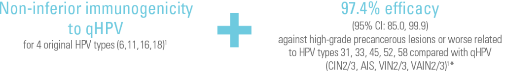 *Phase 3 randomised, double-blind, efficacy, immunogenicity, and safety study. Participants (women aged 16 – 26 [N=14,204]) received three intramuscular injections of the GARDASIL® 9 vaccine (9vHPV) or qHPV at Day 1, Month 2, and Month 6. Efficacy was assessed after a follow-up of up to 67 months after Dose 3 (median follow-up 43 months after Dose 3). The primary outcomes were efficacy of 9vHPV vaccine versus qHPV vaccine to prevent the combined endpoint of high-grade cervical disease (cervical intraepithelial neoplasia Grade 2 or 3, adenocarcinoma in situ, invasive cervical carcinoma), vulvar disease (vulvar intraepithelial neoplasia Grade 2/3, vulvar cancer), and vaginal disease (vaginal intraepithelial neoplasia Grade 2/3, vaginal cancer) related to HPV 31, 33, 45, 52, and 58 and non-inferiority (excluding a decrease of 1·5 times) of HPV 6, 11, 16, and 18 antibody geometric mean titres (GMTs) compared with qHPV vaccine. The PPE population consisted of individuals who received all 3 vaccinations within one year of enrolment, did not have major deviations from the study protocol were naïve (PCR negative and seronegative) to the relevant HPV type(s) (31, 33, 45, 52 and 58) prior to dose one and remained PCR negative to the relevant HPV type(s) through one month post Dose 3 (month 7).